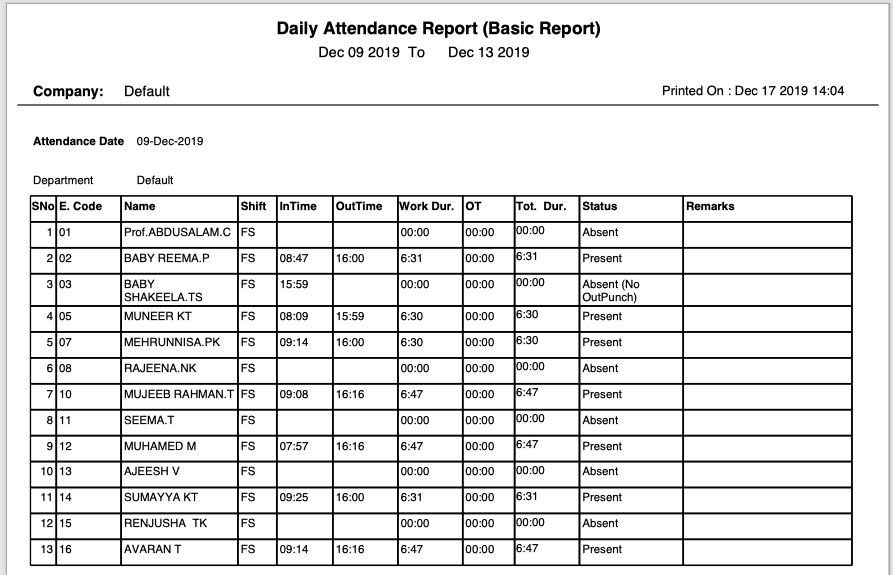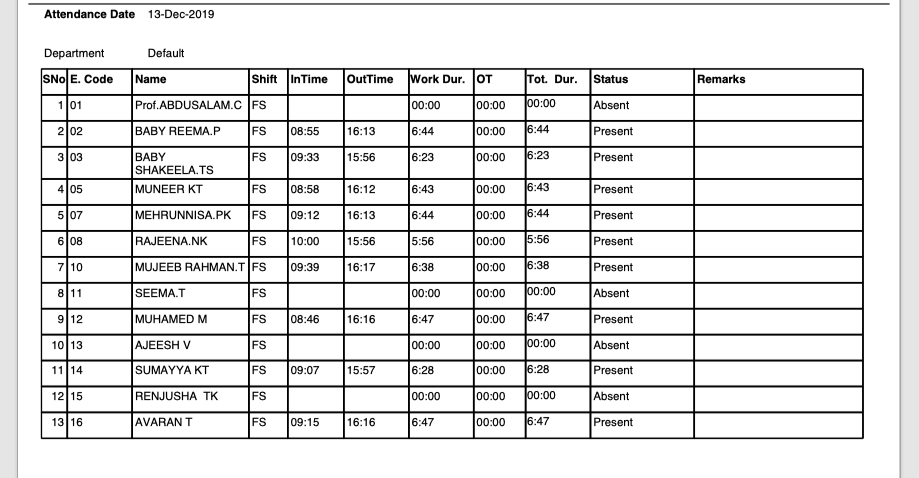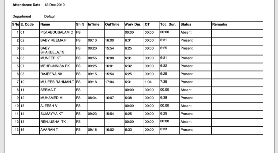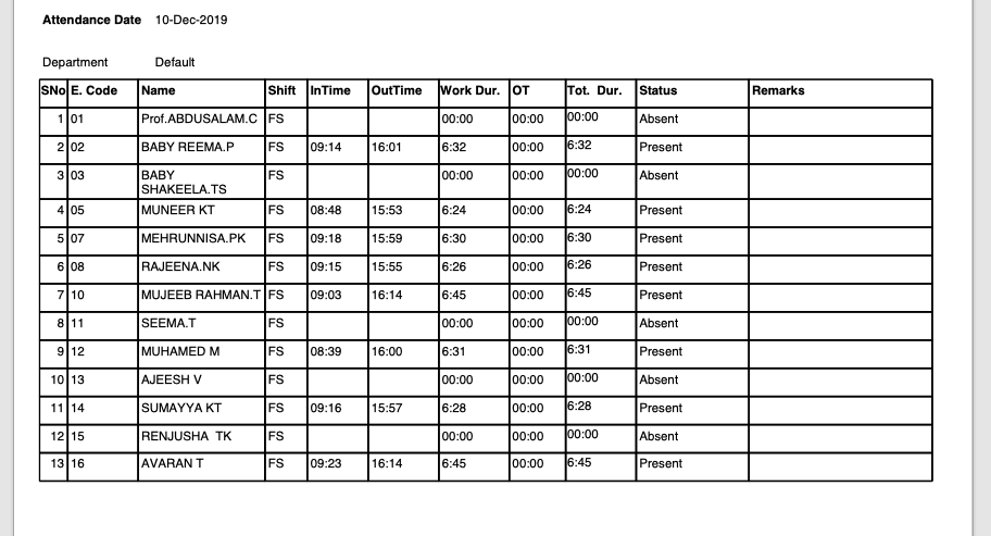 ATTENDANCE REPORT